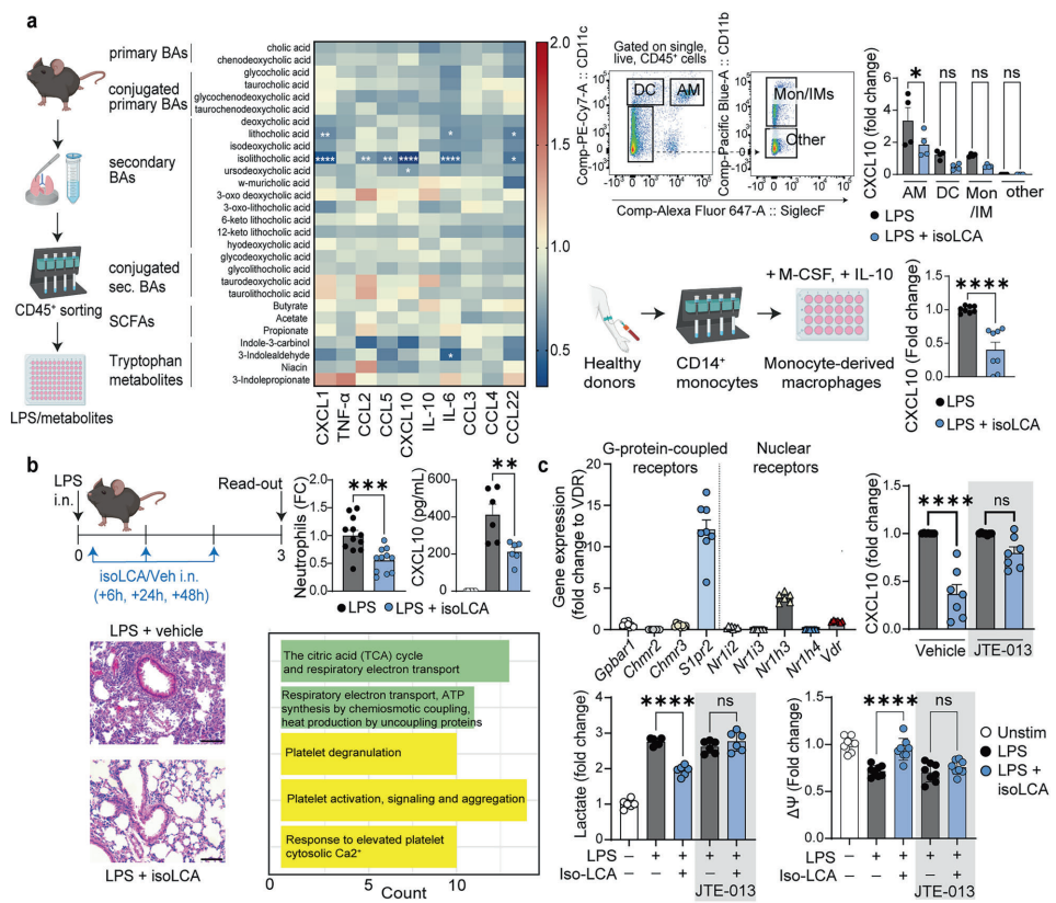 肠道菌群依赖性胆汁酸通过S1PR2介导肺泡巨噬细胞代谢重编程调控肺部炎症的新机制在我们身体的微观世界里,肠道菌群扮演着“隐形工程师”的角色,它们不仅帮助消化食物,更通过产生大量代谢产物远程调控着全身的免疫系统。然而,这些微生物信使如何影响远离肠道的器官(如肺部)的免疫状态,至今仍是科学界亟待破解的谜题。特别是在新冠肺炎(COVID-19)等呼吸道疾病中,临床观察发现重症患者体内次级胆汁酸水平显著降低,这提示我们:菌群代谢物可能掌握着肺部免疫调控的关键钥匙。 带着这样的思考,波兰科学院尼基实验生物学研究所的Tomasz P. Wypych团队在《Signal Transduction and Targeted Therapy》上发表了一项开创性研究。他们发现了一种名为isolithocholic acid (isoLCA) 的肠道菌群依赖性胆汁酸,能够像一把精准的钥匙,打开肺部免疫调控的大门。这项研究不仅揭示了菌群-肺轴调控的新机制,更开创了通过代谢重编程治疗肺部炎症性疾病的新范式。 研究人员运用多学科技术手段展开探索。在细胞模型方面,采用脂多糖(LPS)刺激的小鼠原代肺免疫细胞和人单核细胞来源的巨噬细胞(MDMs)评估胆汁酸的抗炎活性;在动物模型方面,建立LPS诱导的急性肺损伤和呼吸道感染模型,通过鼻腔给予isoLCA观察治疗效果;在机制研究方面,结合荧光激活细胞分选(FACS)、单细胞RNA测序(scRNA-seq)、qPCR和药理学抑制实验,深入解析isoLCA的作用靶点和信号通路。所有人类样本均来自健康供体,动物实验均经过伦理委员会批准。 isolithocholic acid (isoLCA) 靶向肺部免疫